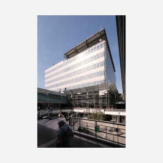 这个立面被设计成一个单层的全玻璃外墙,从地板到天花板是由在车间里组装的的立面块组成。立面块的所有门窗工件都是由香槟色的阳极氧化铝制成。